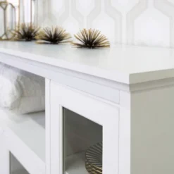 When you need an elegant living room pick-me-up, Saracina Home is in your corner with the Artemis Traditional Windowpane 44” Corner TV Stand for TVs up to 50”. The console’s angled back edges allow it to sit snuggly against any nook or cranny, so you can use your small space to its full potential. Electronics are easy to access from the two open storage cubbies. Look beyond the tempered safety glass doors to see books, games, and décor resting on the two adjustable shelves. The classic windowpane door front design harmonizes with the tapered top surface and base for a refined look to your movie nights.